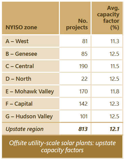 These projects typically have capacity factors well below those of upstate grid-scale solar plants.7 Grid-scale solar capacity factors average about 18% in NYS, while community solar manages only 12.1%, with some areas of the state averaging less than 12%.8