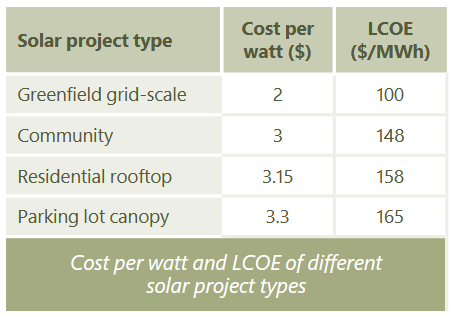 I gave Perplexity AI the job of calculating a levelized cost of energy (LCOE) and construction costs per watt for community solar to compare it with other types of solar projects. Whereas grid-scale solar in NYS was assumed to have a LCOE of at least $100/MWh, community solar’s lower capacity factor and higher construction costs (e.g., due to fewer economies of scale) result in higher costs. Community solar was estimated at $148/MWh,9 putting it slightly below the cost of residential solar.