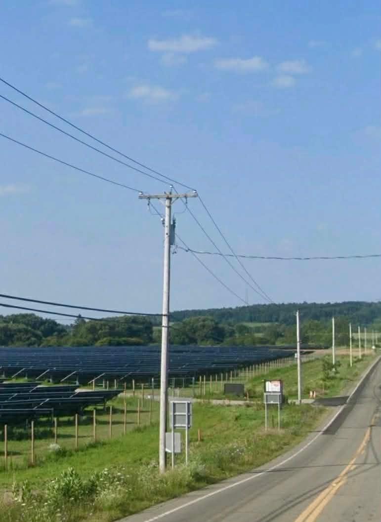 Google Earth Street View image of a community solar project in Chautauqua County NY. The plant is located on the main street of a village but features no screening and a minimal setback from the road