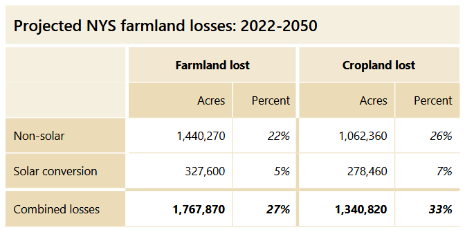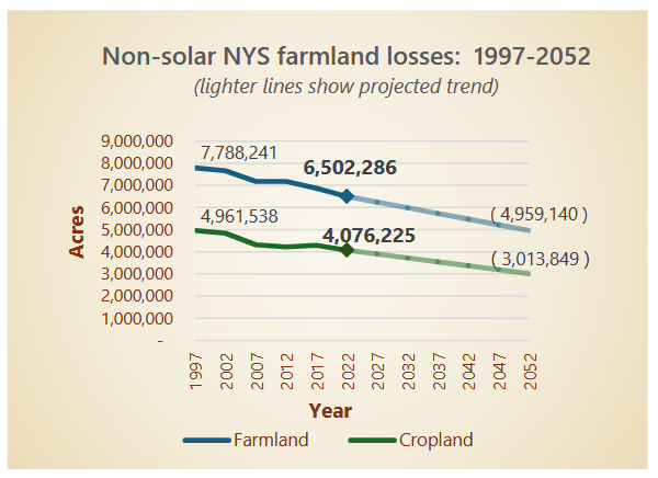In my 2023 Substack publication “Enough land: How will solar development affect upstate New York agriculture?” I looked at the land requirements for solar buildout in upstate NY between now and 2050. The 65-page white paper estimated how much of this buildout is likely to occur on farmland and examines the expected impact on agriculture. One of the most striking things I learned in writing the paper was that NYS has been losing farmland at an astonishing rate apart from widespread solar buildout. Solar development simply adds pressure to an existing problem.