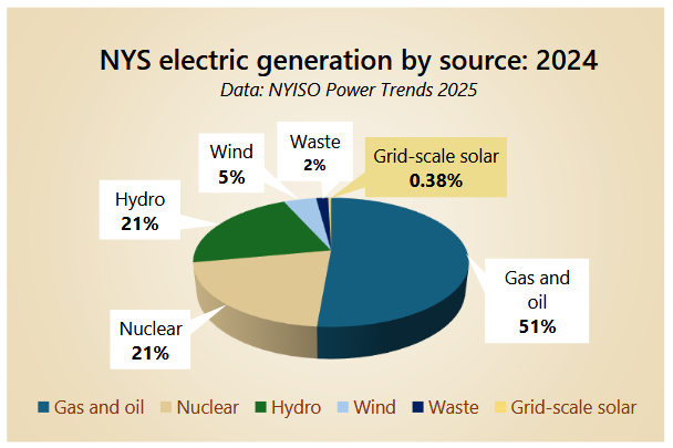 Note that solar development can be divided into grid-scale (facilities >20 MW) and distributed (smaller facilities, including community solar). The latter is being developed relatively quickly. In 2024, though, only 15 grid-scale solar projects generated electricity for NYS, providing about 530 MW of capacity. By 2050, the majority of solar buildout is expected to comprise grid-scale plants, but in 2024, only 0.38% of NYS electric generation came from such projects. The graphic here shows the percentage of electricity generated by grid-scale solar development in relation to other sources in 2024: