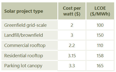 According to Perplexity, the cost per watt of installing solar on landfills averages about $3/watt, and the levelized cost of energy (LCOE) averages about $150/MWh—50% higher than greenfield solar. For purposes of comparison, grid-scale solar buildout on greenfields can be expected to cost about $2/watt, and the LCOE will likely be $100/MWh as of 2026.